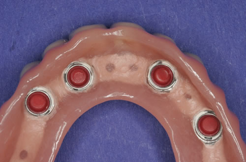 Diese Beispiele ließen sich endlos fortführen. Sie zeigen die Probleme bei der Versorgung zahnloser Kiefer, wie sie immer wieder geschildert werden. Mit Hilfe sehr einfacher Maßnahmen kann durch die Einpflanzung künstlicher Zahnwurzeln eine instabile Prothese soweit befestigt werden, dass die Kau- und Sprechfunktion wieder hergestellt ist. Manchmal kann die alte Prothese weiterverwendet werden, in dem man in die Prothesenbasis Sekundärteile einarbeitet, die für Halt sorgen (Abb. 3.5, 3.6). Bei aufwendigeren Steg- oder Teleskoparbeiten muss auch der Zahnersatz der auf den Implantaten fixiert wird neu angefertigt werden. Diese Arbeiten werden dann brückenartig und sehr grazil gestaltet. (Abb. 3.7 bis 3.12).